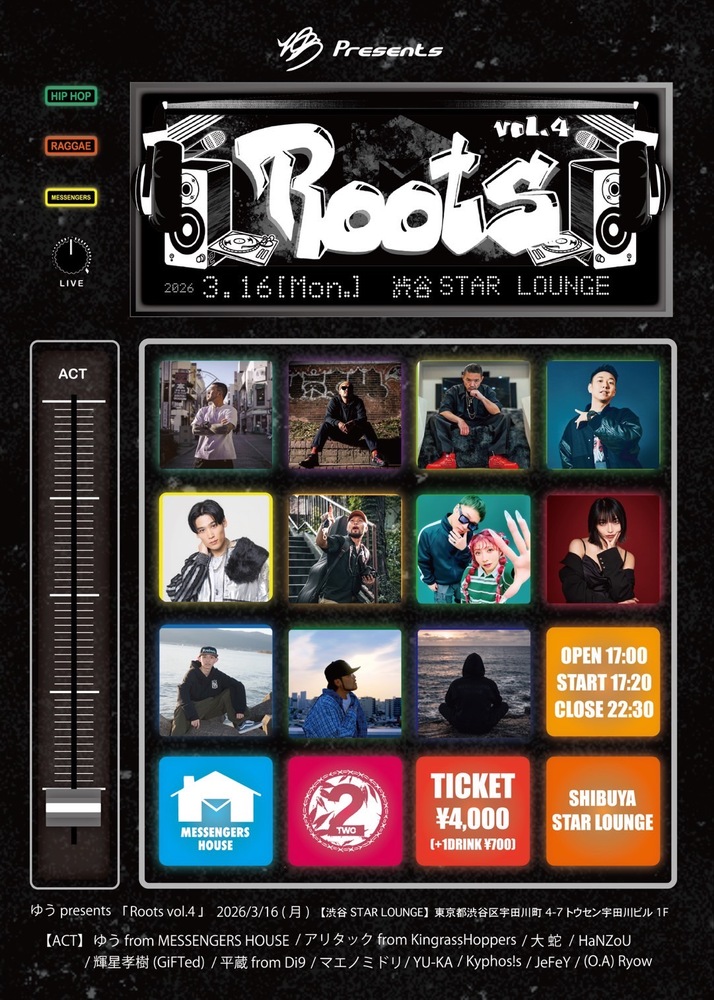 Roots vol.4 SCHEDULE 2026/03/16(月) 渋谷STAR LOUNGE 地図を表示 ⏰OPEN 17:00 / START 17:20 👫18:35頃出演 ⚫︎会場チケット 取り置きチケットになりますので コンタクトより問い合わせください。 URLをコピーする 報告する